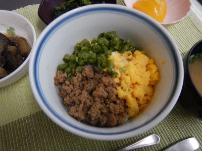 三色丼は、豚挽き肉、炒り卵、さやいんげんです。
