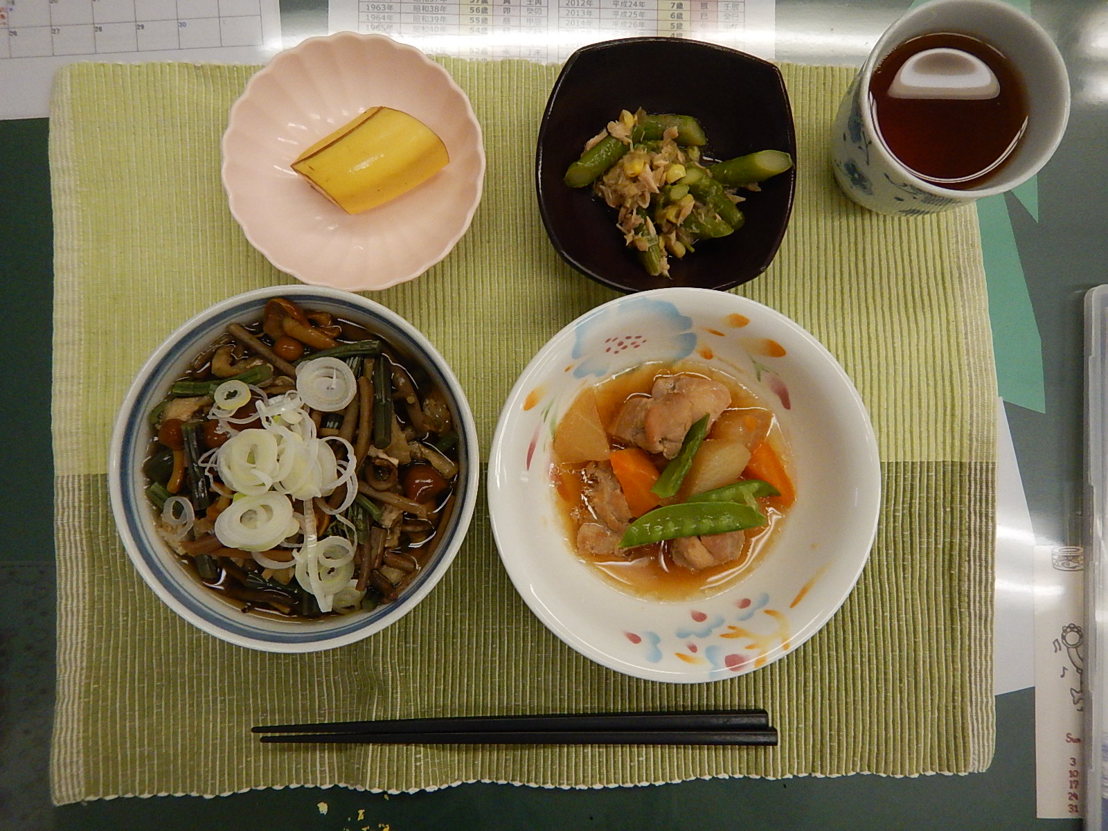 たっぷり、入った山菜なめこそばや鶏肉と大根の煮物に