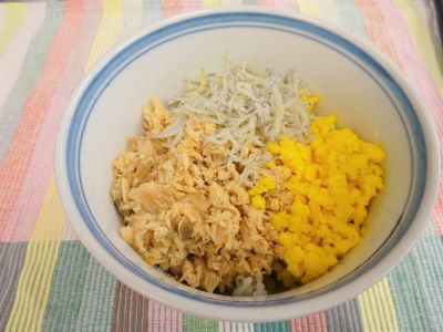 塩気のある鮭としらすに、少し甘めの炒り卵が