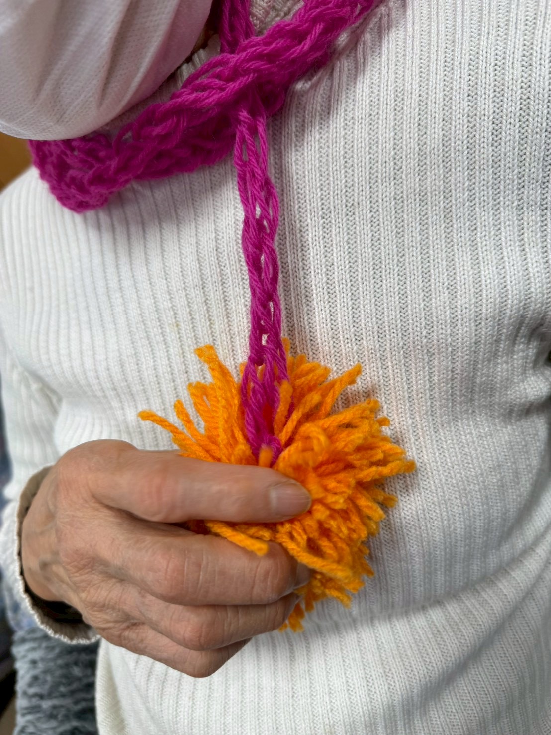 好きな色の毛糸を選び、指を使って編みました。