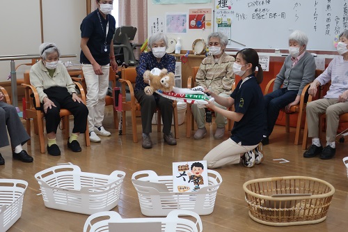 本日のレクリエーションでは、以前から行っている「布で物飛ばし」をレベルアップして、