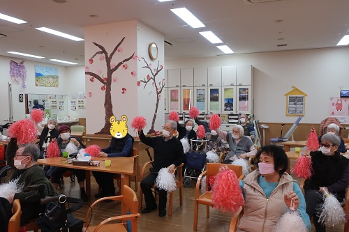 赤と白のポンポンを持っていただき、旗揚げゲームです。